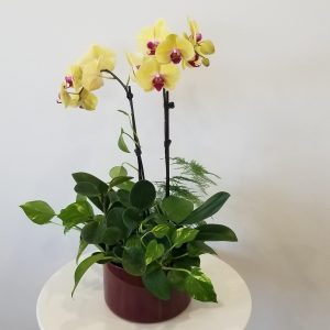 • orchid yellow in deco ceramic flowering plants gifts Toronto Mississauga Etobicoke Brampton Oakville Woodbridge other GTA